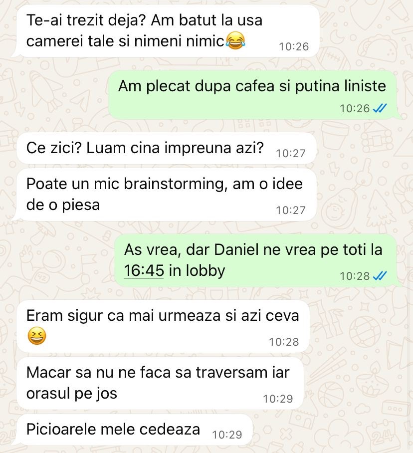 Cumva speram să se fi terminat. Să fie gata cu teambuilding-ul ăsta intens, cu provocările și alergătura. Simțeam că am nevoie de o zi doar pentru mine. Să stau în liniște cu gândurile mele, să le pun pe foaie, să las versurile să se așeze. Eram deja în întârziere cu albumul, cu toate deadline-urile și planurile noastre mari.